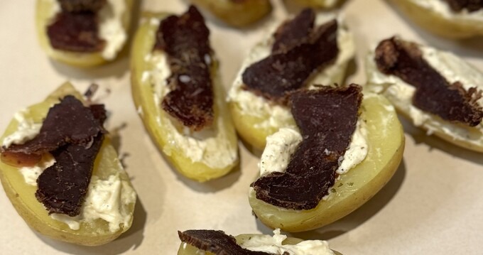 - Étalez une petite portion de fromage frais sur chaque moitié de pomme de terre.