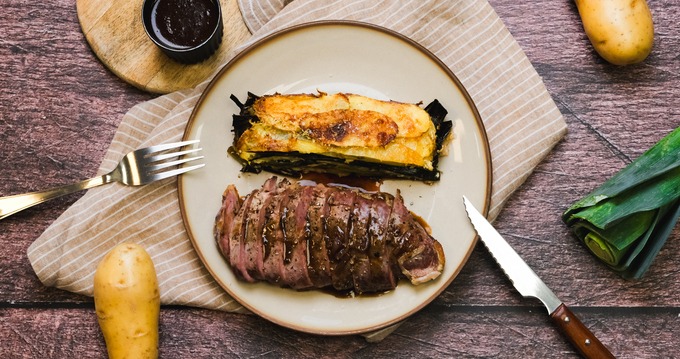- Tailler les magrets et dresser dans les assiettes avec une belle part de millefeuille. Terminer en arrosant le magret généreusement du jus de viande. Proposer le reste en saucière.